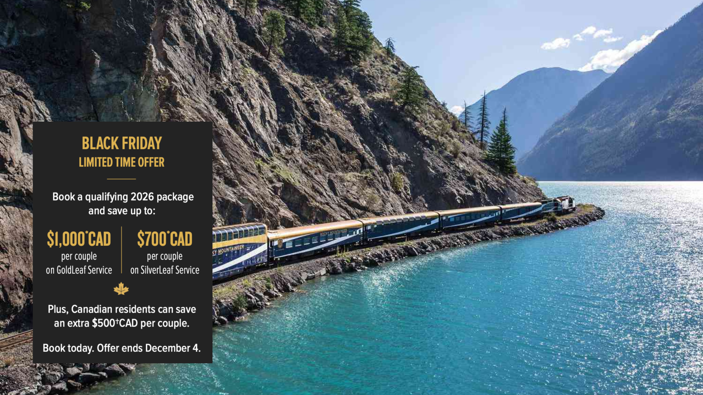 Rocky Mountaineer’s Black Friday event offers up to $1,500 per couple in combined savings on select 2026 GoldLeaf and SilverLeaf Service packages, including an extra discount for Canadian residents.